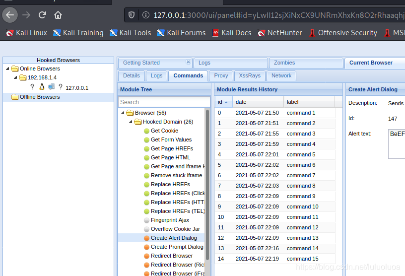 我们还可以点击commands,向目标受害机发送命令,如出现弹框,跳转页面,打开摄像头等等。