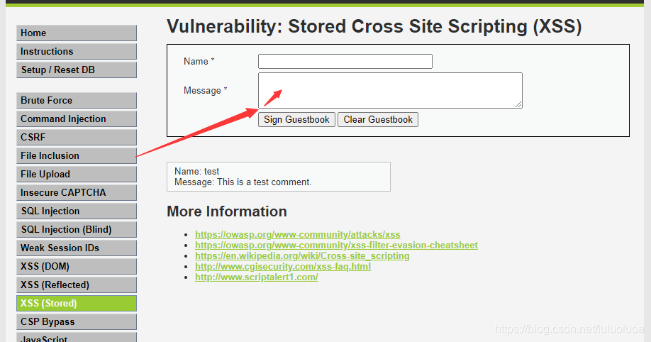 首先需要一个存在xss漏洞的网站,我这里用的dvwa,在dvwa的xss-store就存在xss漏洞,记得难度设置为low。