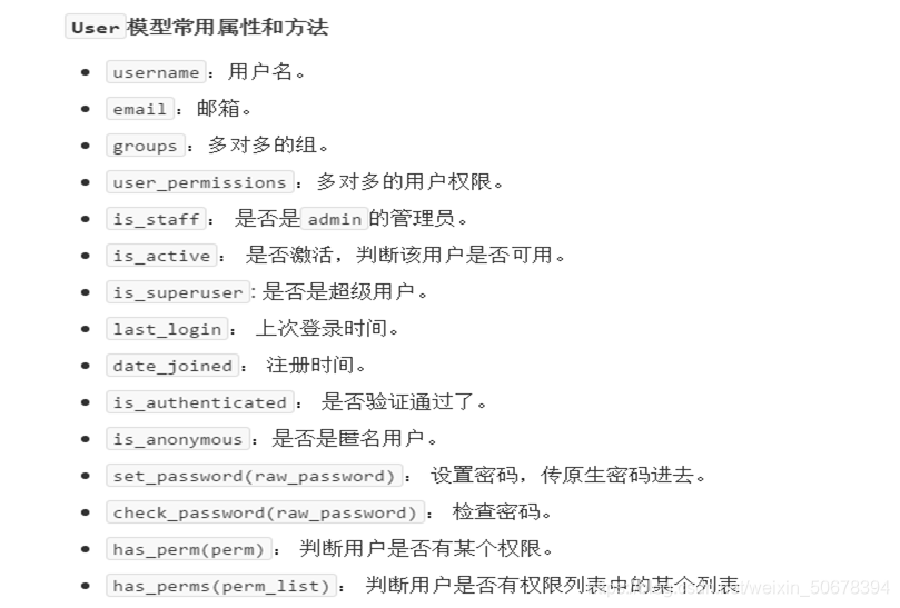 - User:User是auth模块中维护用户信息的关系模式(继承了models.Model), 数据库中该表被命名为auth_user.