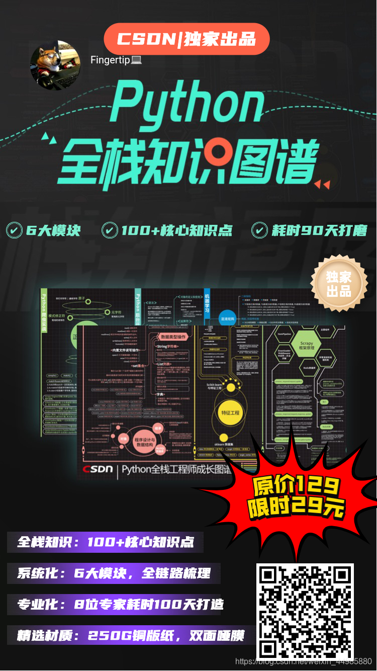 同时给大家推荐一个CSDN官方的Python全栈知识图谱学习路线,涵盖Python六大模块,100+知识点,内容梳理全面,难点,痛点罗列齐全,可以说这本知识图谱上的每一句话,都价值千金,这是CSDN联合6位一线Python工程师,花费3个月反复打磨,旨在帮助大家Python知识体系,具备实战经验,破解开发和面试难题!非常适合学习Python的小伙伴们!原价129,CSDN官方限时限量29元!