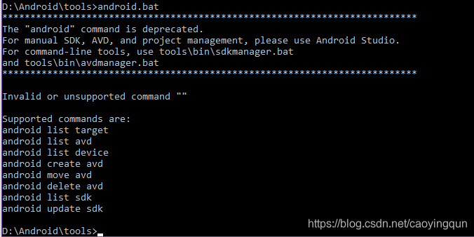 之前安装的android模拟器可以正常运行,后来因为需要在本地进行app打包,安装了Android Studio后,就无法打开android模拟器,检查了环境变量没啥问题。SDK Manager本质上是执行tools目录下面的android命令。遂在cmd中执行android.bat命令发现提示如下图,原来是Google将原来的SDK Manager弃用了。