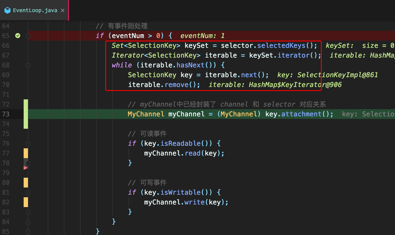 这个循环遍历已选择键集中的每个键,并检测各个键所对应的通道的就绪事件。