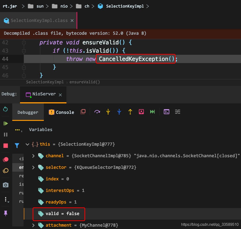 当channel被关闭,该channel上的所有相关key会被自动取消,无论是通过调用其close方法或通过中断一个线程阻塞于所述channel的I/O操作。同时,该 channel 注册到的 selector 也会将该 key 设置为被取消键。