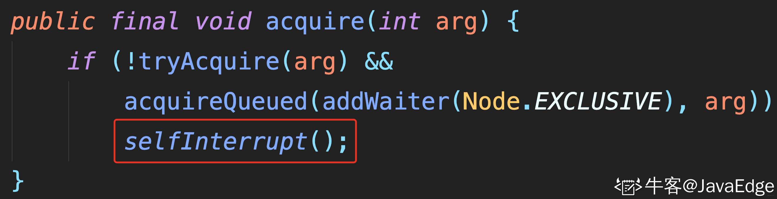 - 线程在等待资源的过程中被唤醒,唤醒后还是会不断尝试获取锁,直到抢到锁。即在整个流程中,并不响应中断,只是记录中断的记录。最后抢到锁返回了,那么如果被中断过的话,就需要补充一次中断