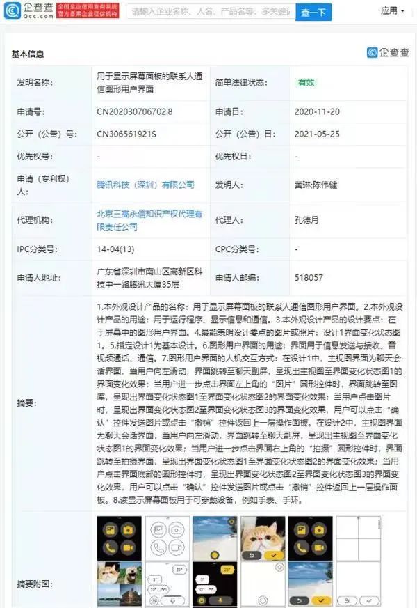 近日,腾讯公开了一项“用于显示屏幕面板的聊天交互图形用户界面、用于显示屏幕面板的联系人通信图形用户界面”的专利。