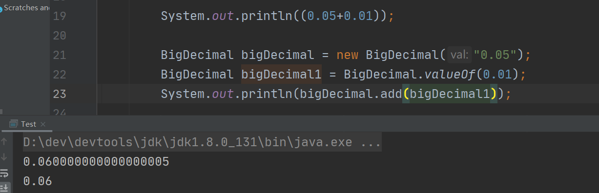 我们常规预想的0.01+0.05就应该等于0.06啊,可是结果并非我们所想,换做使用BigDecimal的话就可以得到和我们与其的结果了。