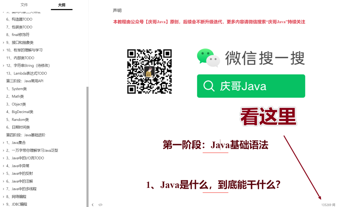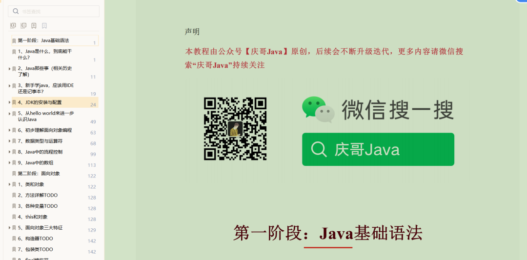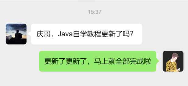就是这么个事情,对了,我把我录制的视频教程和这份十几万字的Java自学教程以及一些其他资料都整理好了,你们可以在我的公众号【庆哥Java】页面回复“Java”即可领取!