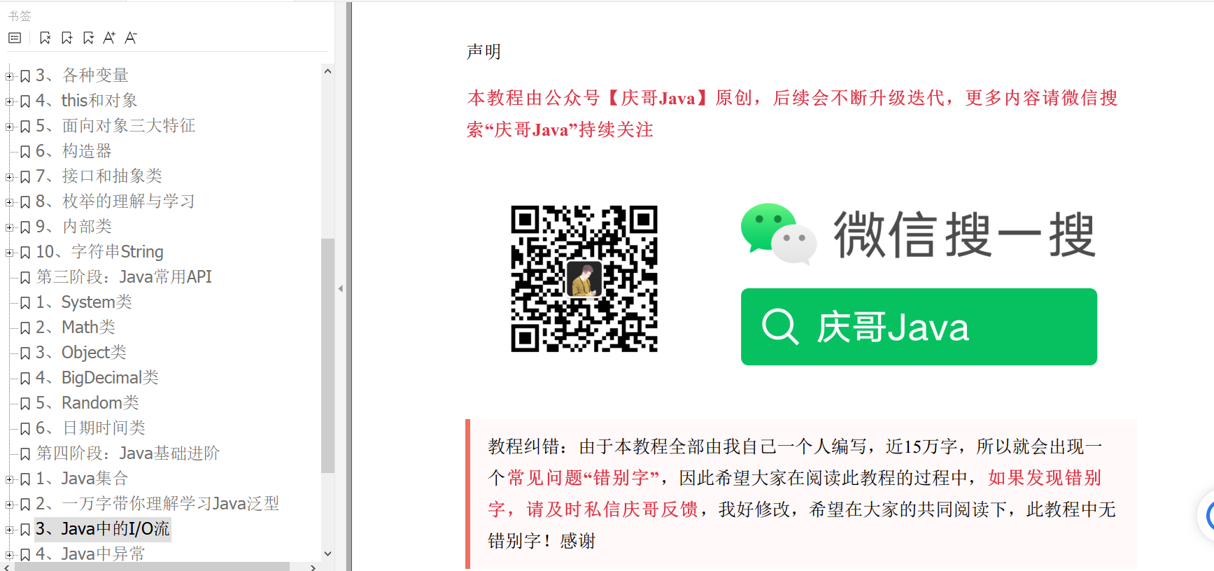 就是这样的:庆哥原创的15万字的零基础Java自学教程,文末给出下载方式!
