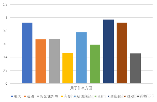 由上图可以看出,在参加社团活动、看视频、阅读书籍和学习方面,外国同学花费时间明显多于中国学生;恋爱和运动方面外国同学花时少于中国;别的方面二者相差不大;