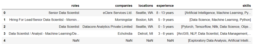 现在,变量 `url_list_copy_cleaned` 有超过 3000 个岗位 list 的 URL,下一步是点击所有 1000 页,提取详细信息。被抓取的信息包括企业、位置、经验、角色、技能。