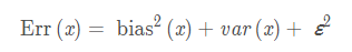如上图,我们假设一次射击就是一个机器学习模型对一个样本进行预测,射中红色靶心位置代表预测准确,偏离靶心越远代表预测误差越大。偏差则是衡量射击的蓝点离红圈的远近,射击位置即蓝点离红色靶心越近则偏差越小,蓝点离红色靶心越远则偏差越大;方差衡量的是射击时手是否稳即射击的位置蓝点是否聚集,蓝点越集中则方差越小,蓝点越分散则方差越大。