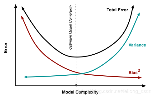 在实际的问题中噪音是数据自带的,没有办法优化,因此为了优化模型,降低模型的泛化误差,我们便从降低偏差和方差入手,但是方差和偏差存在权衡问题,即在优化一个时便会导致另一个升高,下图给出了泛化误差和偏差、方差的变化关系: