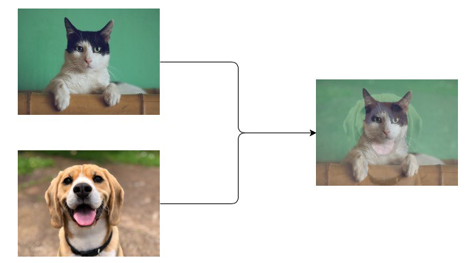 假设需要对狗和猫的图像进行分类,给出一组带有标签的图像集合(即[1,0]代表狗;[0, 1] 代表猫),图像混合的过程是对两幅图像进行简单的平均,它们的标签对应一个新数据。
