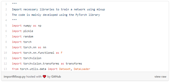 整个项目通过PyTorch库(包括torchvision)来实现,图像混合需要从beta分布中生成样本,这可以方便地通过NumPy库实现,也可以使用随机库来混合随机图像。利用以下代码导入库: