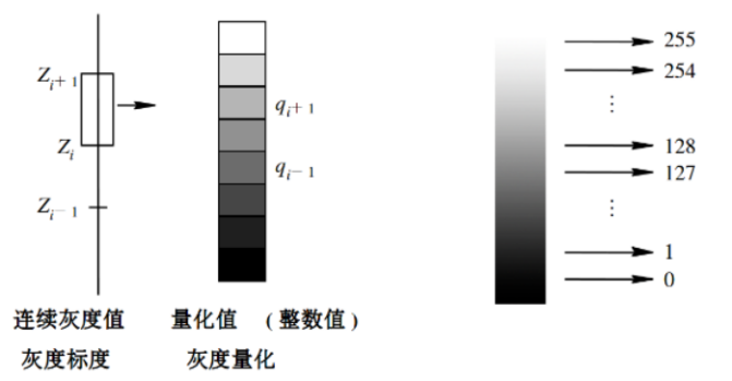 所谓量化(Quantization),就是将图像像素点对应亮度的连续变化区间转换为单个特定值的过程,即将原始灰度图像的空间坐标幅度值离散化。量化等级越多,图像层次越丰富,灰度分辨率越高,图像的质量也越好;量化等级越少,图像层次欠丰富,灰度分辨率越低,会出现图像轮廓分层的现象,降低了图像的质量。图1是将图像的连续灰度值转换为0至255的灰度级的过程。