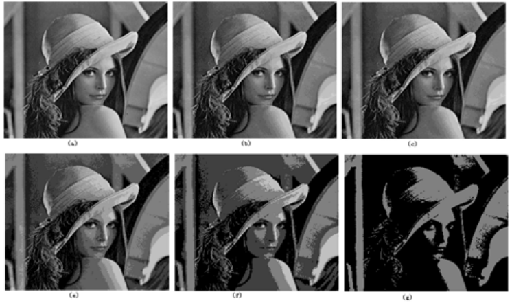 图2是对比不同量化等级的“Lena”图。其中(a)的量化等级为256,(b)的量化等级为64,(c)的量化等级为16,(d)的量化等级为8,(e)的量化等级为4,(f)的量化等级为2。