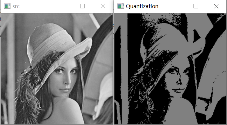 #显示图像cv2.imshow("src", img)cv2.imshow("Quantization", new_img)#等待显示cv2.waitKey(0)cv2.destroyAllWindows()123456789101112131415161718192021222324252627282930313233