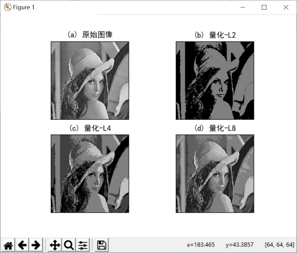如果量化等级为2,则将使用两种灰度级表示原始图片的像素(0-255),灰度值小于128的取0,大于等于128的取128;如果量化等级为4,则将使用四种灰度级表示原始图片的像素,新图像将分层为四种颜色,0-64区间取0,64-128区间取64,128-192区间取128,192-255区间取192,依次类推。