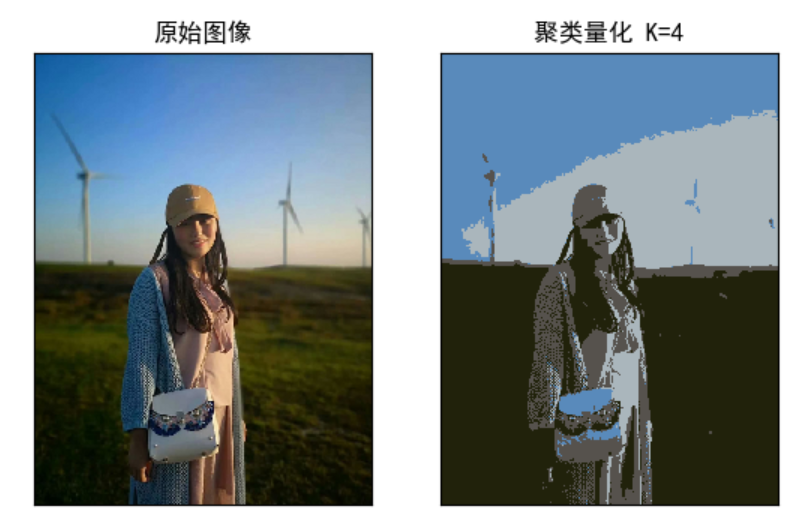 cv2.TERM_CRITERIA_MAX_ITER, 10, 1.0)#设置标签flags = cv2.KMEANS_RANDOM_CENTERS#K-Means聚类 聚集成4类compactness, labels, centers = cv2.kmeans(data, 4, None, criteria, 10, flags)#图像转换回uint8二维类型centers = np.uint8(centers)res = centers[labels.flatten()]dst = res.reshape((img.shape))#图像转换为RGB显示img = cv2.cvtColor(img, cv2.COLOR_BGR2RGB)dst = cv2.cvtColor(dst, cv2.COLOR_BGR2RGB)#用来正常显示中文标签plt.rcParams['font.sans-serif']=['SimHei']#显示图像titles = ['原始图像', '聚类量化 K=4'] images = [img, dst] for i in range(2):