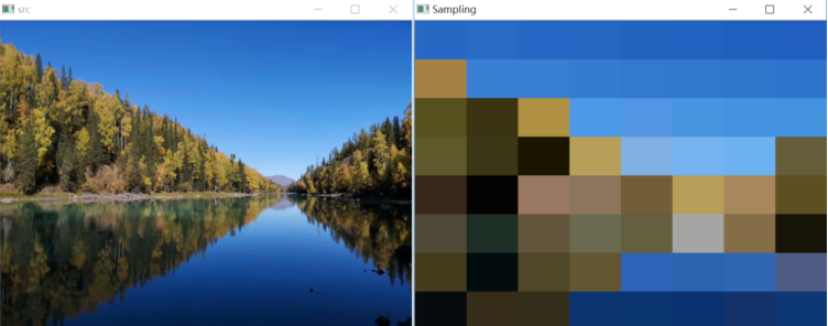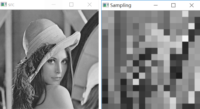 #显示图像cv2.imshow("src", img)cv2.imshow("Sampling", new_img)#等待显示cv2.waitKey(0)cv2.destroyAllWindows()12345678910111213141516171819202122232425262728293031323334353637383940414243444546