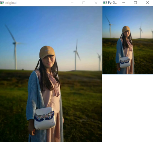 import matplotlib.pyplot as plt#读取原始图像img = cv2.imread('nv.png')#图像向下取样r = cv2.pyrDown(img)#显示图像cv2.imshow('original', img)cv2.imshow('PyrDown', r)cv2.waitKey()cv2.destroyAllWindows()1234567891011121314151617