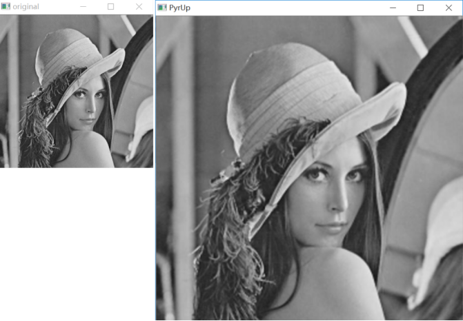 import matplotlib.pyplot as plt#读取原始图像img = cv2.imread('lena.png')#图像向上取样r = cv2.pyrUp(img)#显示图像cv2.imshow('original', img)cv2.imshow('PyrUp', r)cv2.waitKey()cv2.destroyAllWindows()1234567891011121314151617