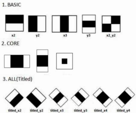 Haar特征很简单,分为三类:边缘特征、线性特征、中心特征和对角线特征,组合成特征模板。特征模板内有白色和黑色两种矩形,并定义该模板的特征值为白色矩形像素和减去黑色矩形像素和。Haar特征值反映了图像的灰度变化情况。