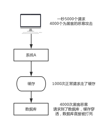 假如客户端每秒发送5000个请求,其中4000个为黑客的恶意攻击,即在数据库中也查不到。举个例子,用户id为正数,黑客构造的用户id为负数,如果黑客每秒一直发送这4000个请求,缓存就不起作用,数据库也很快被打死。