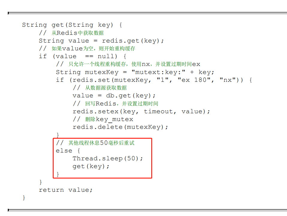 2、当从缓存拿到的数据为null,重新从数据库加载数据的过程使用分布式锁,保证只有一个线程执行缓存重建过程,其他客户端可以选择等待+周期重新请求缓存,流程例如下面伪代码: