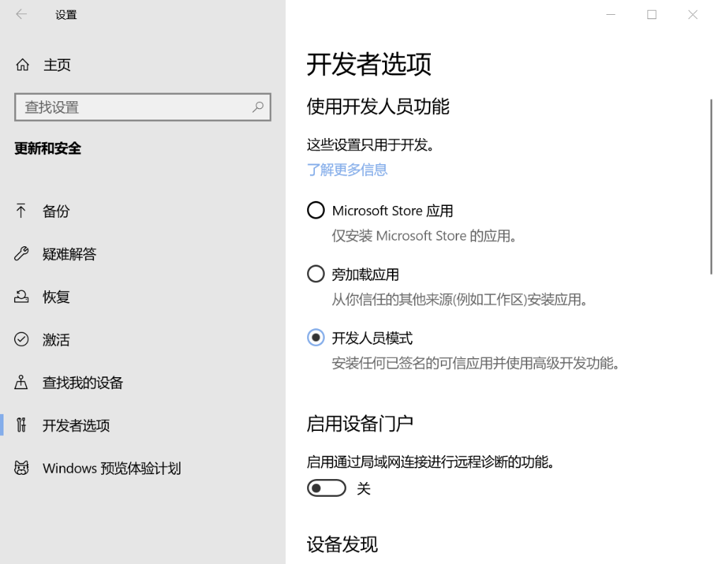 然后打开电脑的设置,在更新一栏改为开发者模式