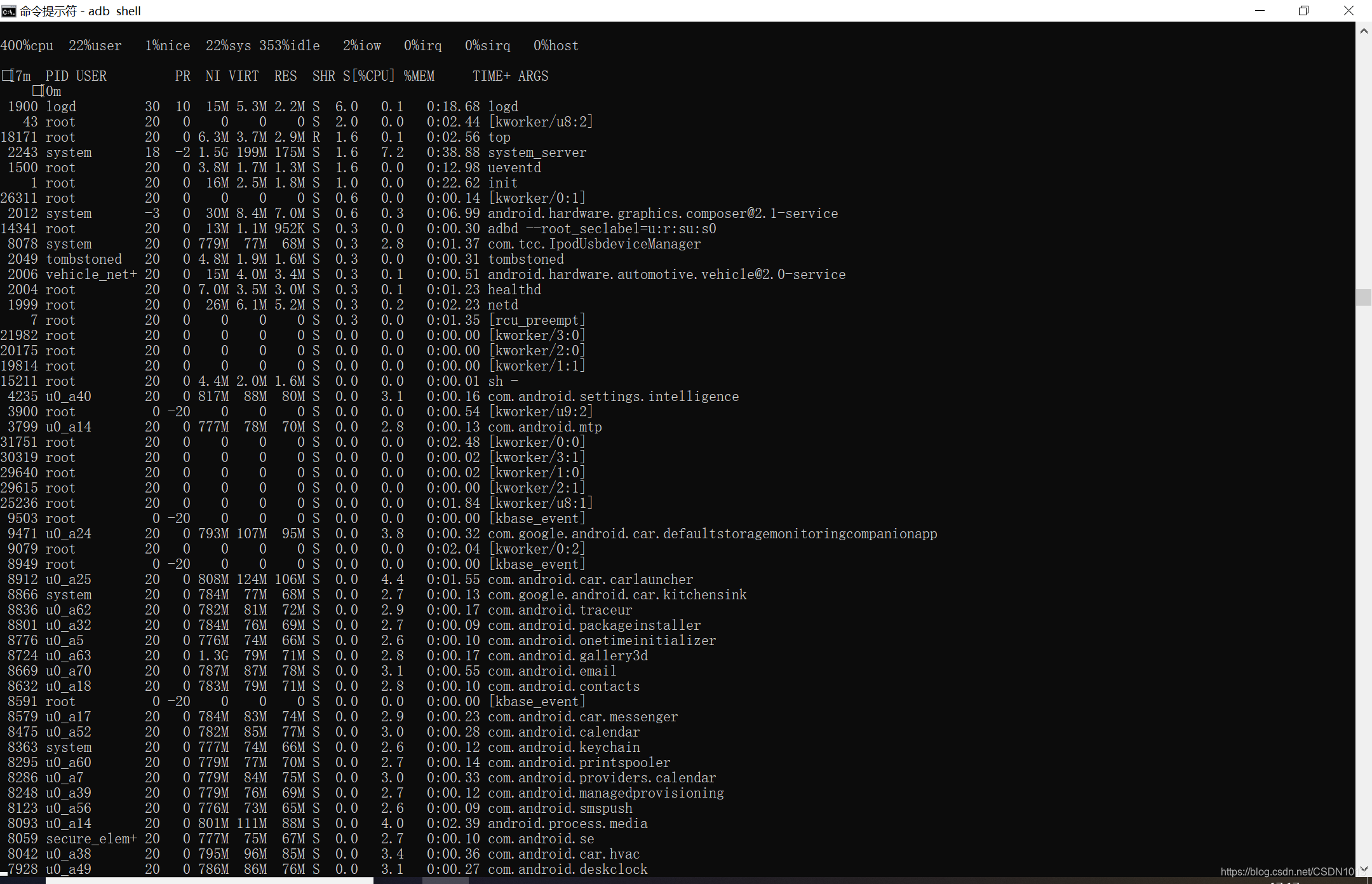 第一种方法:通过top命令查看CPU的占用情况。如下例图,adb输入“top”后,可以看到: