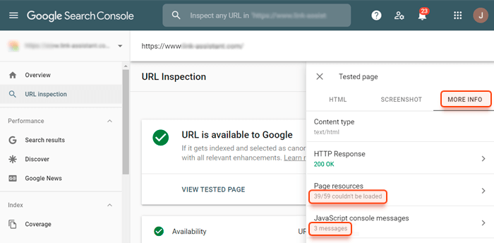 要查看页面上的哪些资源会导致渲染问题(并实际查看您是否有任何问题),请登录 Google Search Console帐户,转到URL 检查,输入要检查的 URL,单击测试实时 URL按钮,然后单击"View Tested Page"。