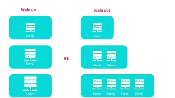 向外扩展也称为“横向扩展”,我们可以向资源池添加更多实体(机器、服务)。水平扩展比垂直扩展更难实现,因为我们需要在构建系统之前考虑好。