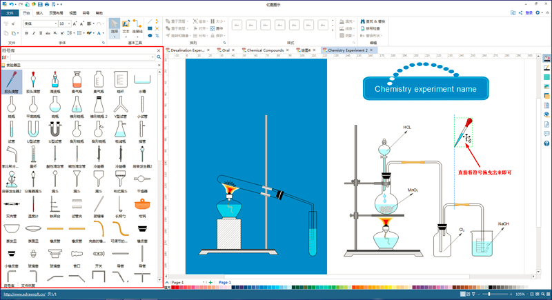 2、进入画布后,打开左侧的符号库,可以找到许多专业的用于科学研究的绘制符号,选择需要的符号直接拖曳到画布中即可使用。每个符号下方都有相对应的注释,不用担心符号太多而分不清的问题。(PS:软件所提供的所有符号均为矢量图)