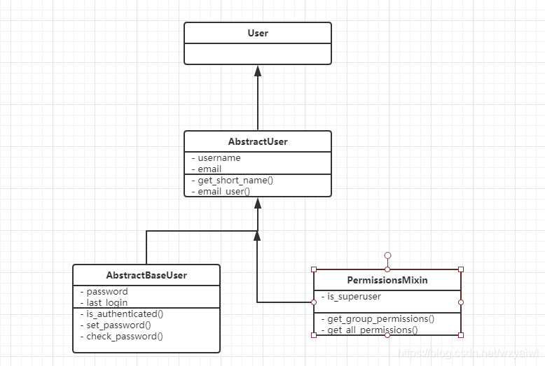 在auth中user继承自AbstractUser,其中AbstractUser又继承自AbstractBaseUser和PermissionsMixin,其中AbstractBaseUser只保存了密码和登陆时间,PermissionsMixin提供了权限先关的字段,比如:is_superuser和组合权限表之间的关联。