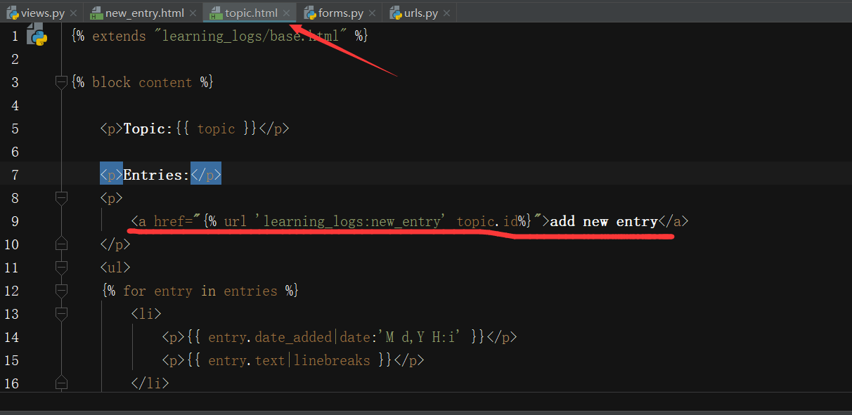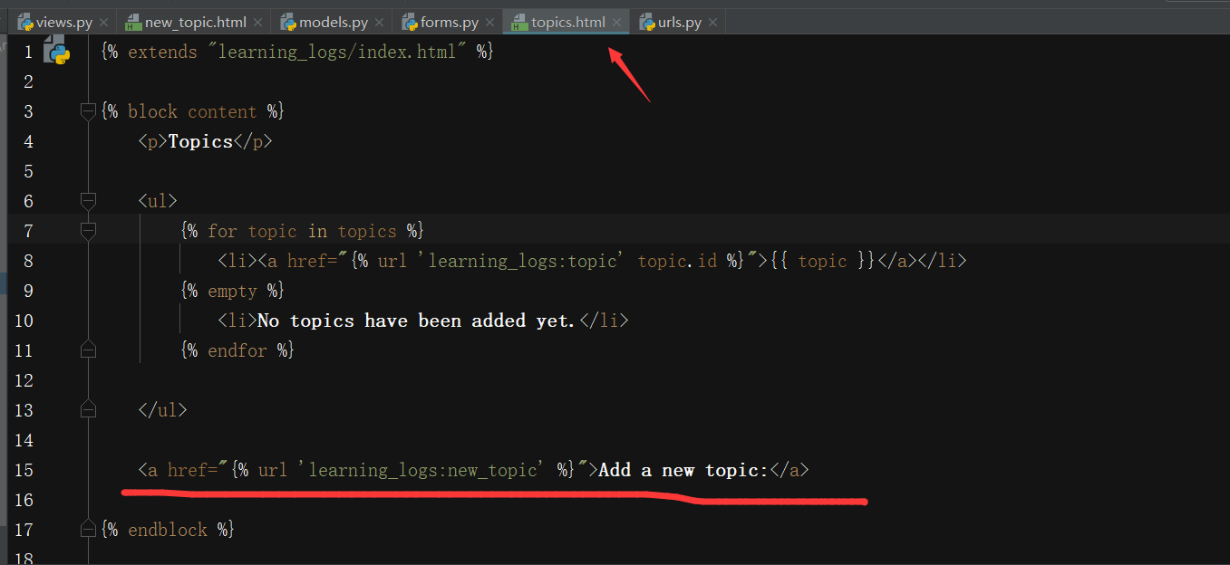 接下来,我们在页面topics中添加一个到页面new_topic的链接: