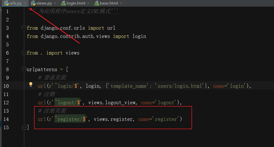 为实现这种重定向,需要修改settings.py,让Django知道到哪里去查找登录页面——在settings.py末尾添加如下代码: