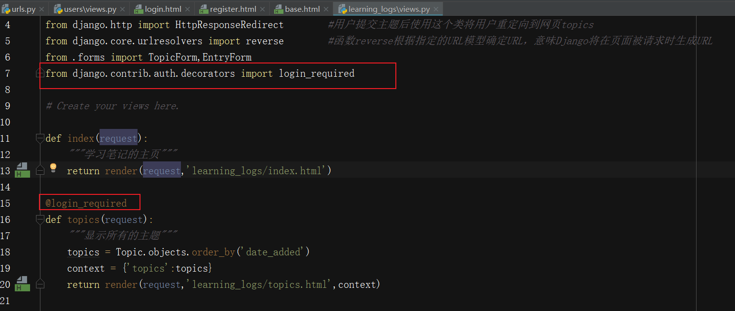 装饰器检查用户是否已登录,仅当用户登录时,Django才运行topics()的代码;如果未登录,就重定向到登录页面。