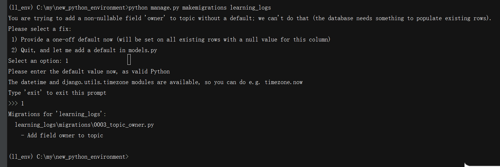 首先执行命令makemigrations。然后,Django指出我们试图给既有模型Topic添加一个不可为空的字段,而该字段没有默认值。