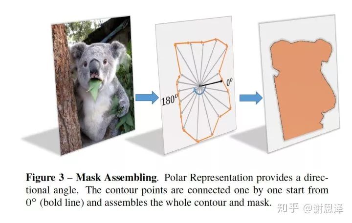 首先,输入一张原图,经过网络可以得到中心点的位置和n(n=36 is best in our setting)根射线的距离,其次,根据角度和长度计算出轮廓上的这些点的坐标,从0°开始连接这些点,最后把联通区域内的区域当做实例分割的结果。