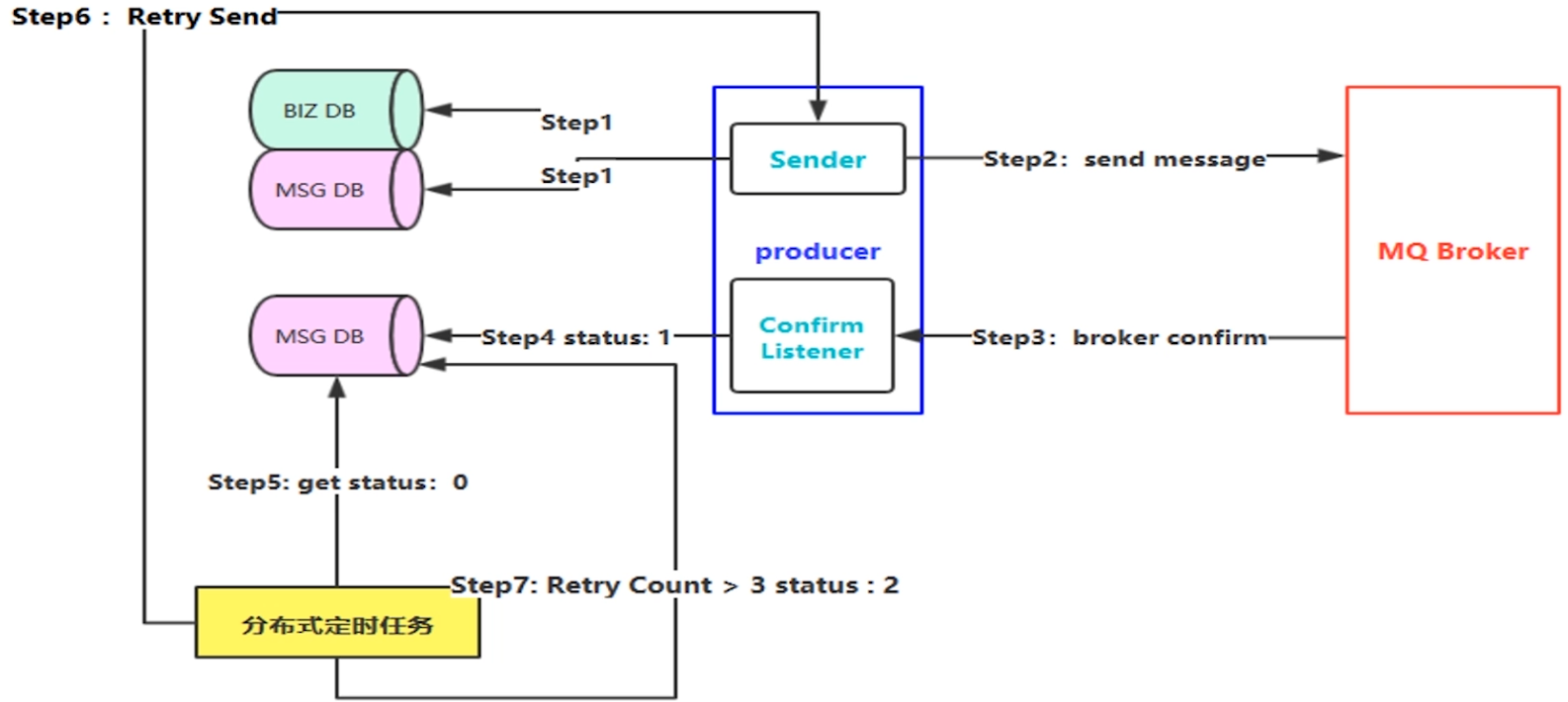 - Step6:将状态status为0的数据进行二次重试发送,每重试一次