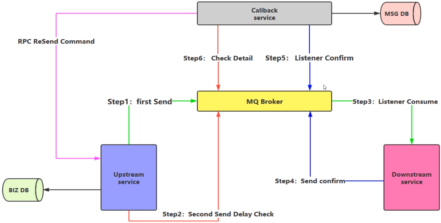 - Step6:几分钟之后,Step2发送了消息确认数据,回调服务接收到了该消息,会和消息库中的消息进行一个比对检查,假如消息库中没有该消息的确认,回调服务就会发起一个ReSend Command命令,通知上游服务