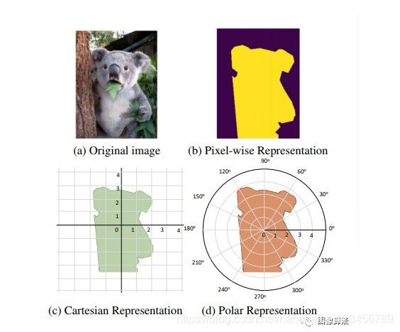 具有不同蒙版表示形式的实例分割。(a)是原始图像。(b)是逐像素Mask版表示。(c、d)通过其轮廓分别代表笛卡尔和笛卡尔坐标。