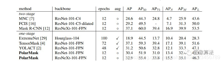 可以看出,在没有任何trick的情况下,PolarMask在Resnext101 FPN的情况下实现了32.9的配置,虽然不是Stoa,但也很有竞争力。我们目前没有使用许多常见的技巧可以上升,如ms-train和长训练期。相比之下,其他的单阶段方法使用mstrain和更长的训练时间。作者表示将进一步改进和努力提高性能。