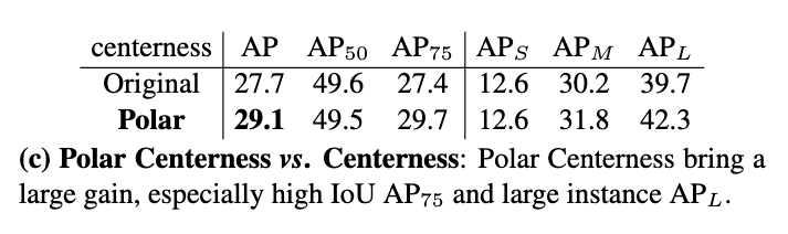 根据消融实验,Polar Centerness可以有效提高1.4的性能,同时不增加网络复杂度。结果如下图所展示