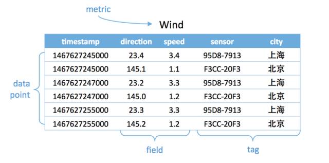如下图,度量为 Wind,每一个数据点都具有一个 timestamp,两个 field:direction 和 speed,两个 tag:sensor、city。它的第一行和第三行,存放的都是 sensor 号码为 95D8-7913 的设备,属性城市是上海。随着时间的变化,风向和风速都发生了改变,风向从 23.4 变成 23.2;而风速从 3.4 变成了 3.3。