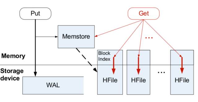 可以看到 LSM tree 核心思想就是通过内存写和后续磁盘的顺序写入获得更高的写入性能,避免了随机写入。但同时也牺牲了读取性能,因为同一个 key 的值可能存在于多个 HFile 中。为了获取更好的读取性能,可以通过 bloom filter 和 compaction 得到,这里限于篇幅就不详细展开。