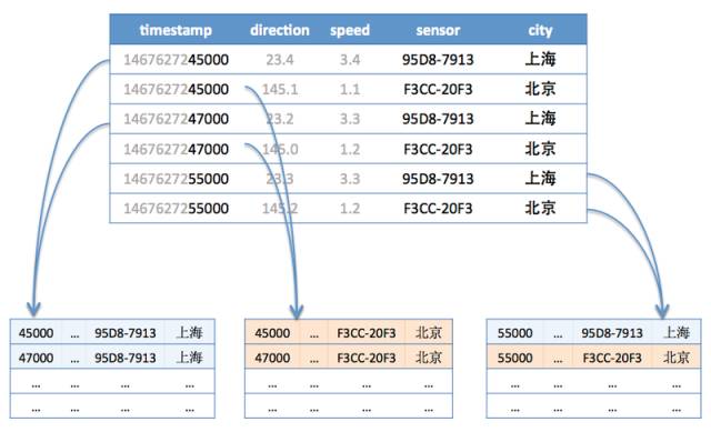 如下图,第一行和第三行都是同样的 tag(sensor=95D8-7913;city= 上海),所以分配到同样的分片,而第五行虽然也是同样的 tag,但是根据时间范围再分段,被分到了不同的分片。第二、四、六行属于同样的 tag(sensor=F3CC-20F3;city= 北京)也是一样的道理。