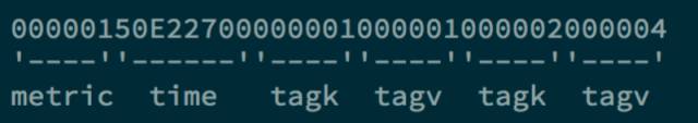 他的 timestamp 是小时对齐的,也就是说一个 row key 下最多存储一个小时的数据。并且需要将构成 row key 的 metric 和 tags 都转成对应的 uid 来减少存储空间,避免 Hfile 索引太大。下图是真实的 row key 示例。