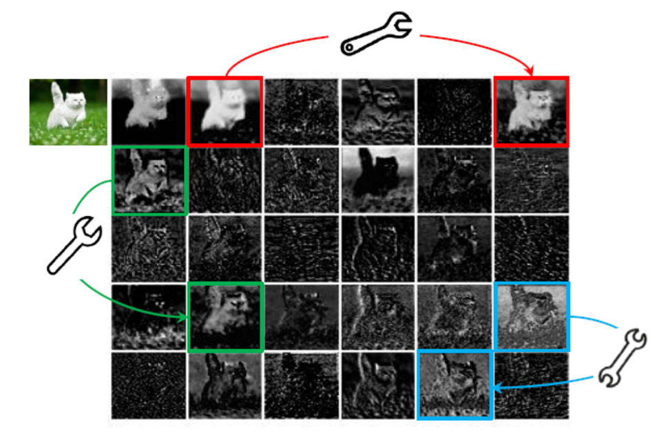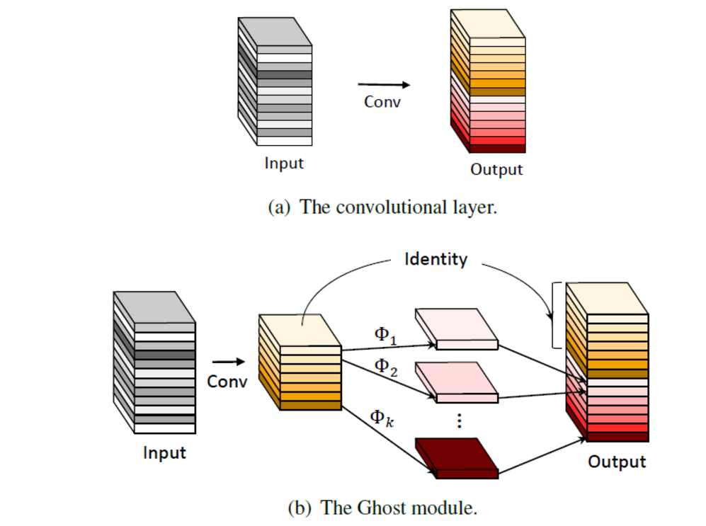 如上图所示,在ResNet-50中,将经过第一个残差块处理后的特征图拿出来,其中三个相似的特征图使用相同颜色的框圈出。其中一个特征图可以通过对另一个特征图进行简单的变换(用扳手表示)来近似得到。这些相似的特征映射对,就类似彼此的虚像,作者用Ghost表示。作者分析出冗余特征是网络成功的关键,本文没有刻意避开这些,而是使用两个步骤代替常规卷积。第一部分就是常规的卷积但是它们的数量会受到严格的限制,以此生成基准特征。将第一部分得到的特征图作为固有卷积,应用一系列的线性变换生成更多更丰富特征图。在不改变输出特征图尺寸的情况下,与普通卷积神经网络相比,Ghost模块的参数总需求和计算复杂度都有所降低。